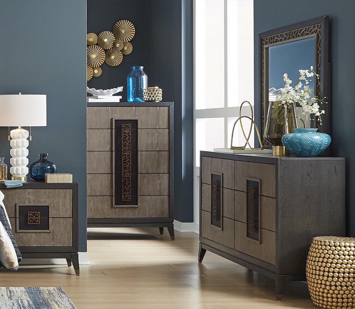 אלמנטים אלו מהווים גם את ידיות הפתיחה עצמן של מגירות שידות הצד והקומודה.