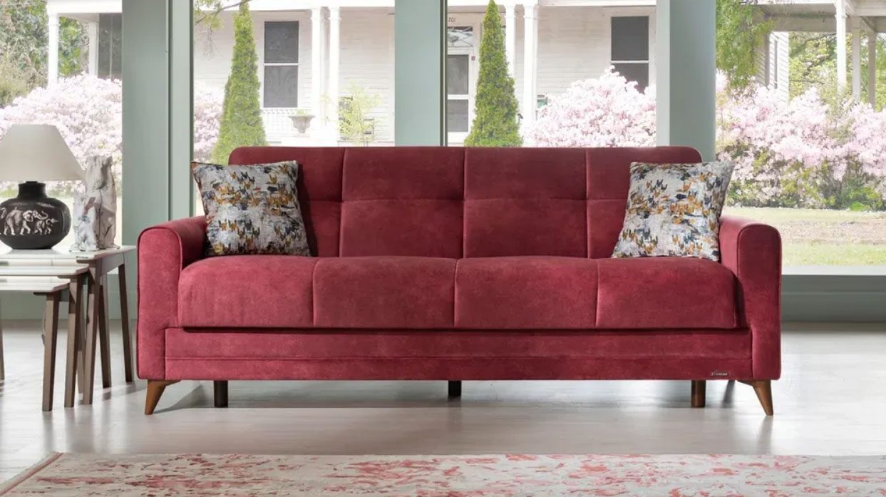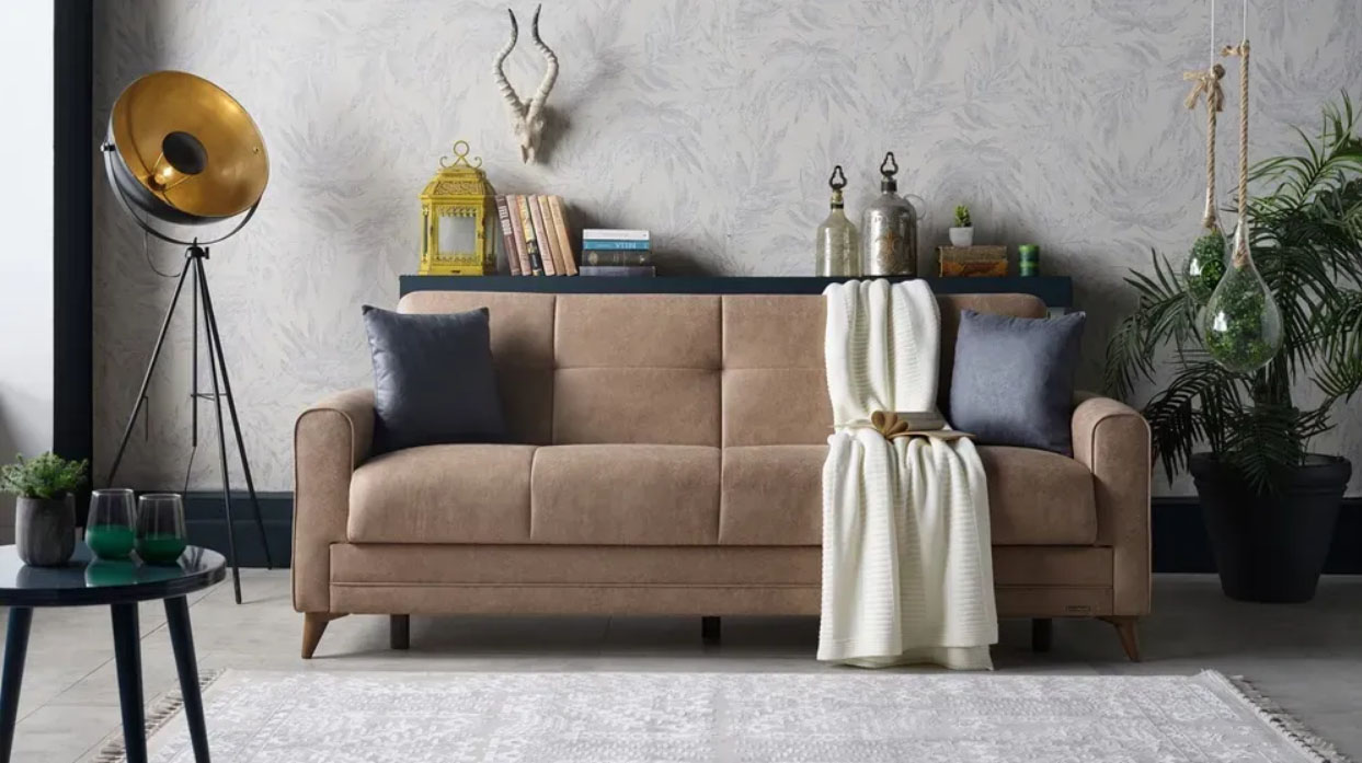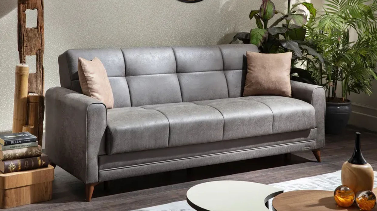 ספה תלת מושבית, בעיצוב עכשווי וצעיר, נפתחת למיטה.